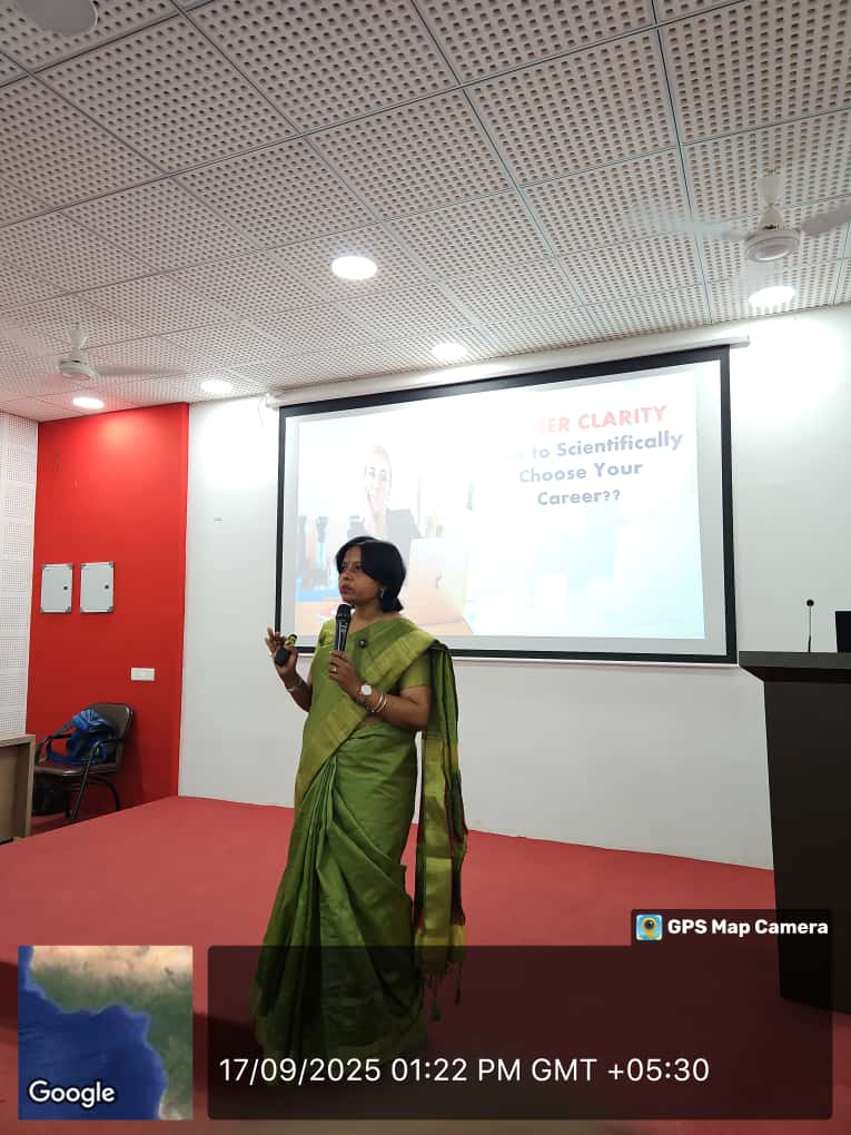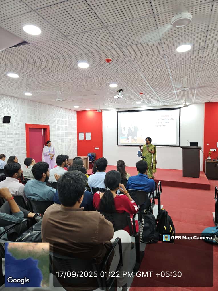 A total of 35 students from Sem-5, Integrated MBA – 5 Year Program registered for the Career Clarity Seminar through a Google Form, which helped in organizing the session effectively. The 1.5-hour session began with an introduction by the guest speaker on the importance of career clarity, self-awareness, and professional planning. Students participated in interactive discussions and an activity to assess their strengths, personality traits, and potential career paths. The seminar concluded with key takeaways and practical tips for creating a personal career roadmap. Feedback forms were also collected from students to gather their perspectives and improve future sessions .
